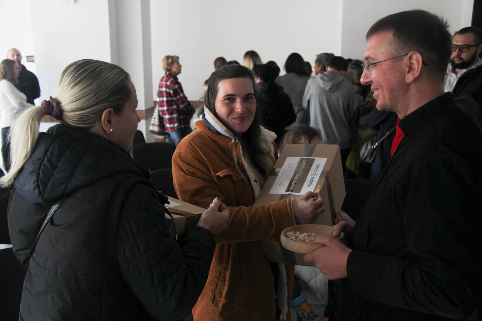 Цього дня зустріч розпочали із Божественної Літургії на якій молились родини внутрішньо переміщених осіб, які проживають в місті Вишневе та в околицях. Опісля Літургії 50 родин отримали продуктові набори від Патріаршої фундації «Мудра справа».