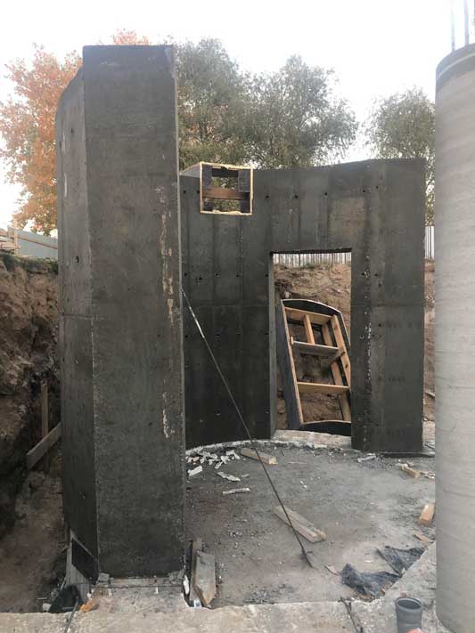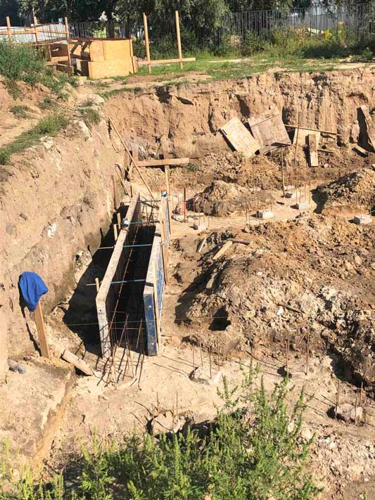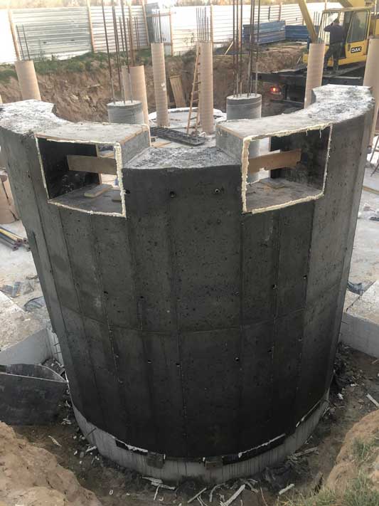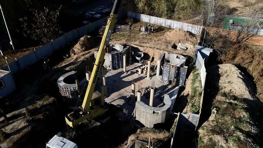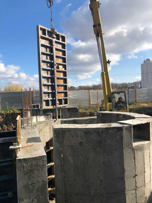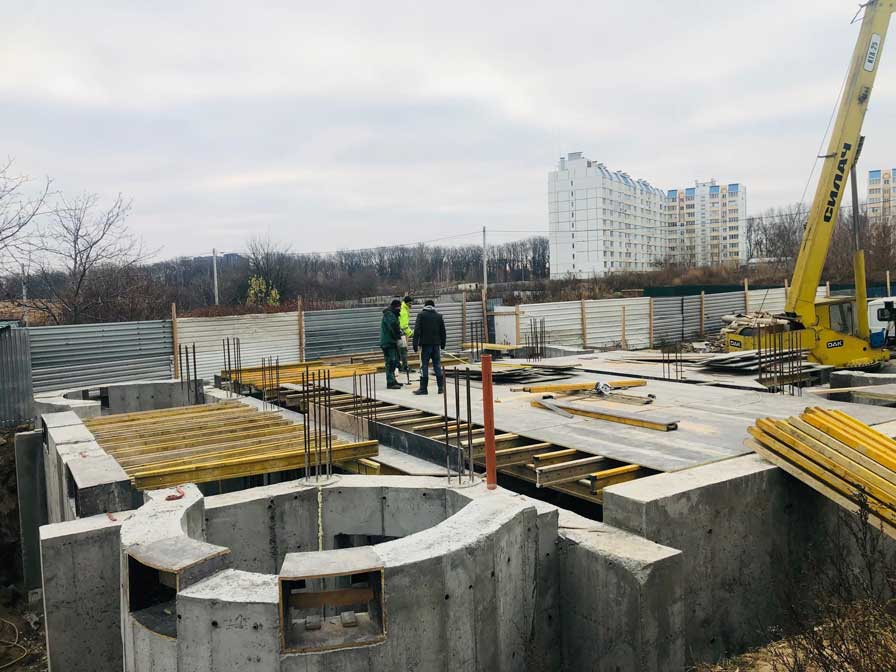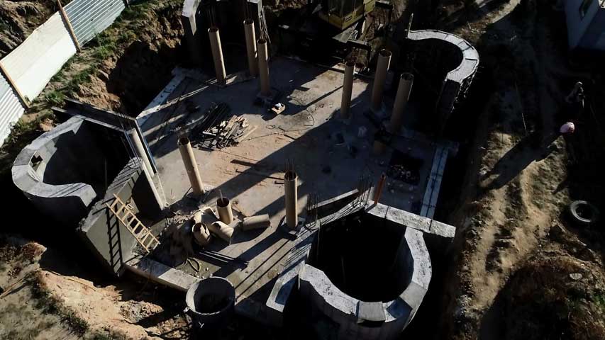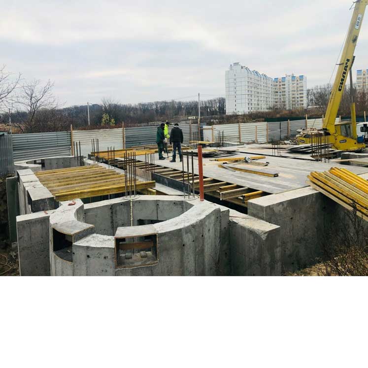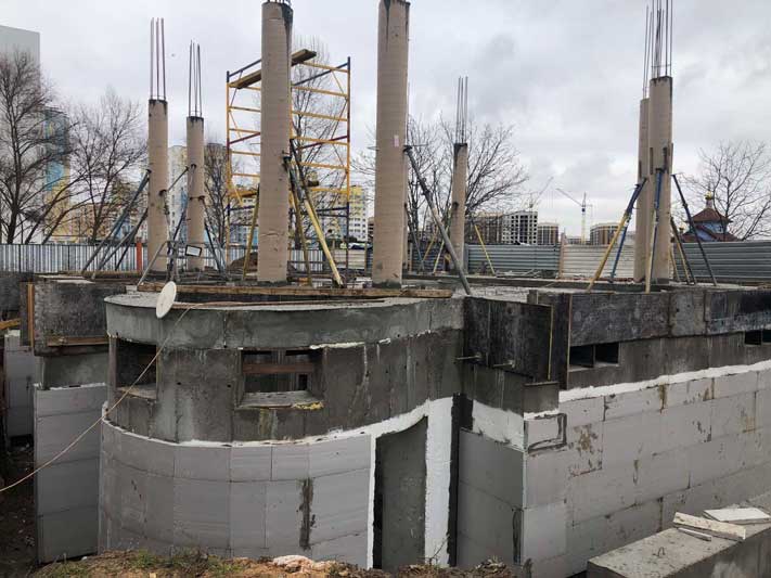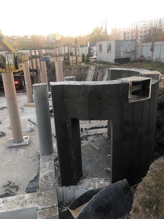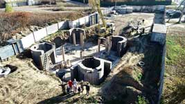 Раді повідомити, що минулого тижня підрядна організація завершила зведення 4 напівкруглих бетонних основ храму та розпочала зведення бокових монолітних стін з бетону.