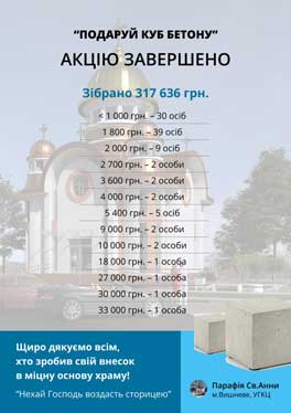 Дякуємо за фінансову підтримку жертводавцям храму: родина Гуць – 3.000 грн. , Мищенко Павліна – 500 грн., анонімна пожертва – 4.341 грн., онлайн пожертва – 9.850 грн, о. Дмитро Романко (Львів) – 2.000 грн. Нехай Господь винагородить усіх наших жертводавців!