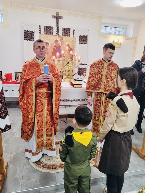 Звертаючись до молоді, о. Володимир наголосив: «Нехай цей Вифлеємський вогонь, який ви багато років розносите по всій Україні, пригадує нам про Божественне Світло, яке приніс на землю Син Божий, народившись у Вифлеємі. Нехай це світло скерує нас до перемоги і довгоочікуваного миру!»