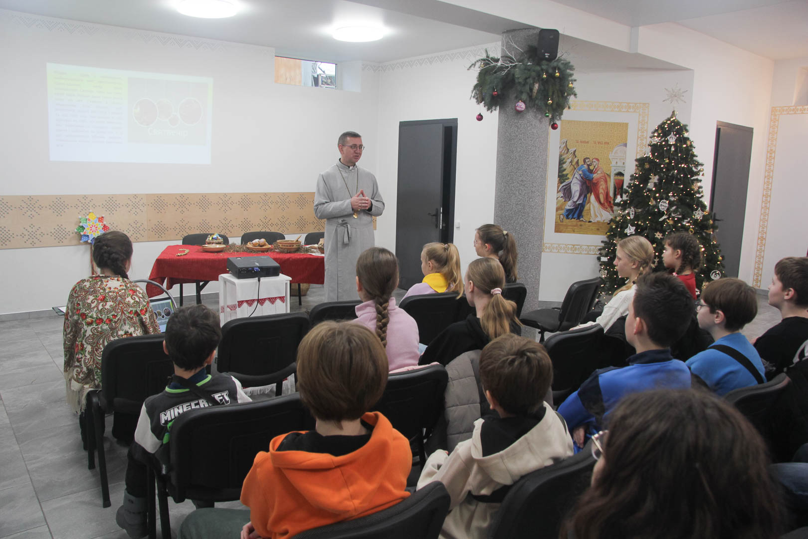 Зустріч розпочалася вітальним словом отця Володимира Мальчина, який розповів про подію Народження Ісуса Христа, її глибоке духовне значення та сенс Різдва для кожного християнина. «Сьогодні ми переживатимемо подію Різдва за українськими традиціями: сіно пригадуватиме про стаєнку, коляда – як ангели співали. І це все для того, щоб пригадати, що наш Бог не є далеким від людини, але стає Одним із нас».