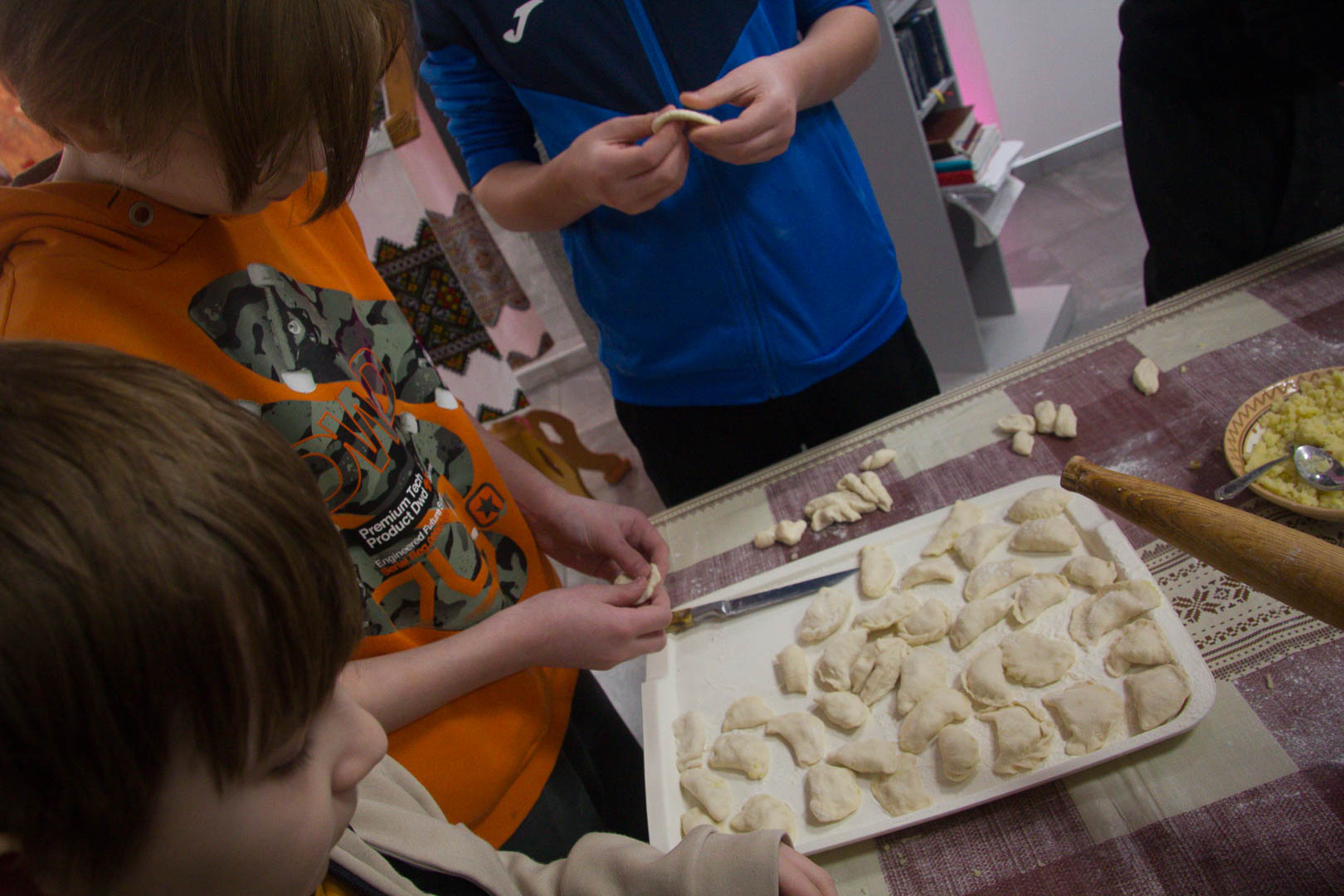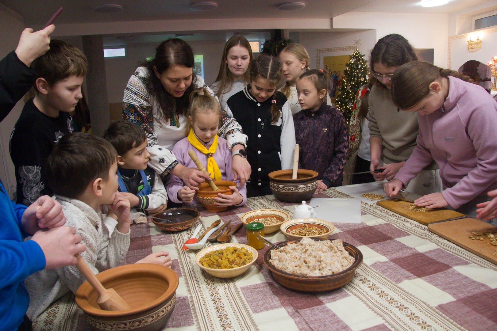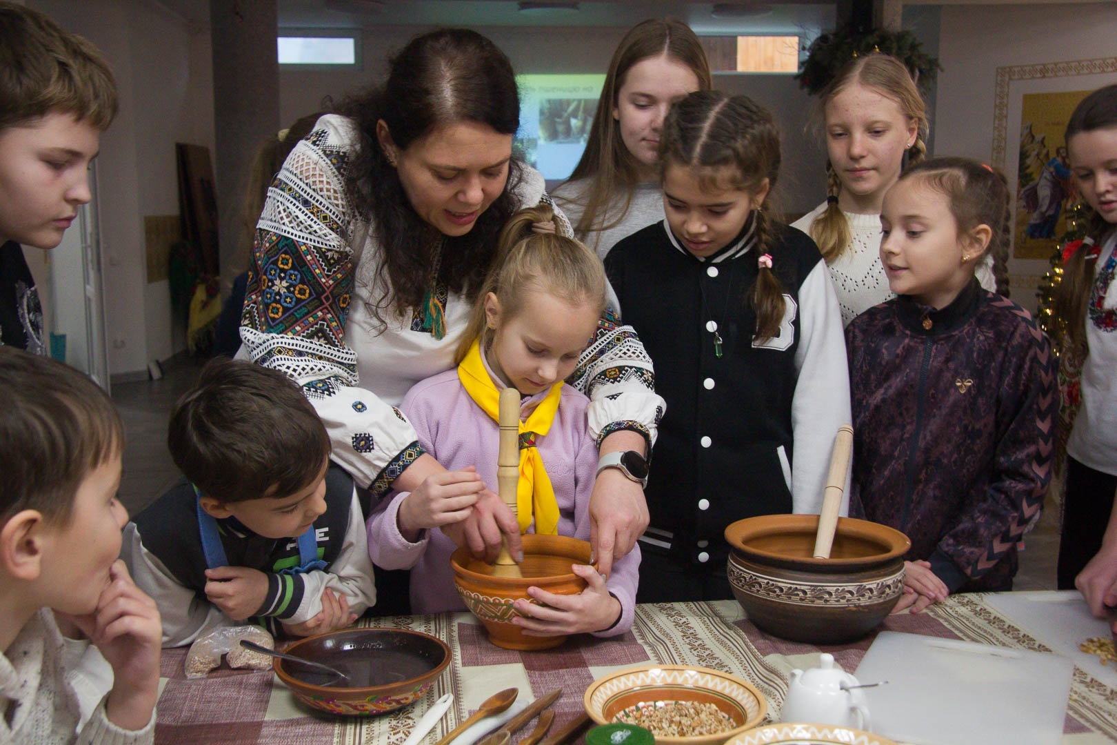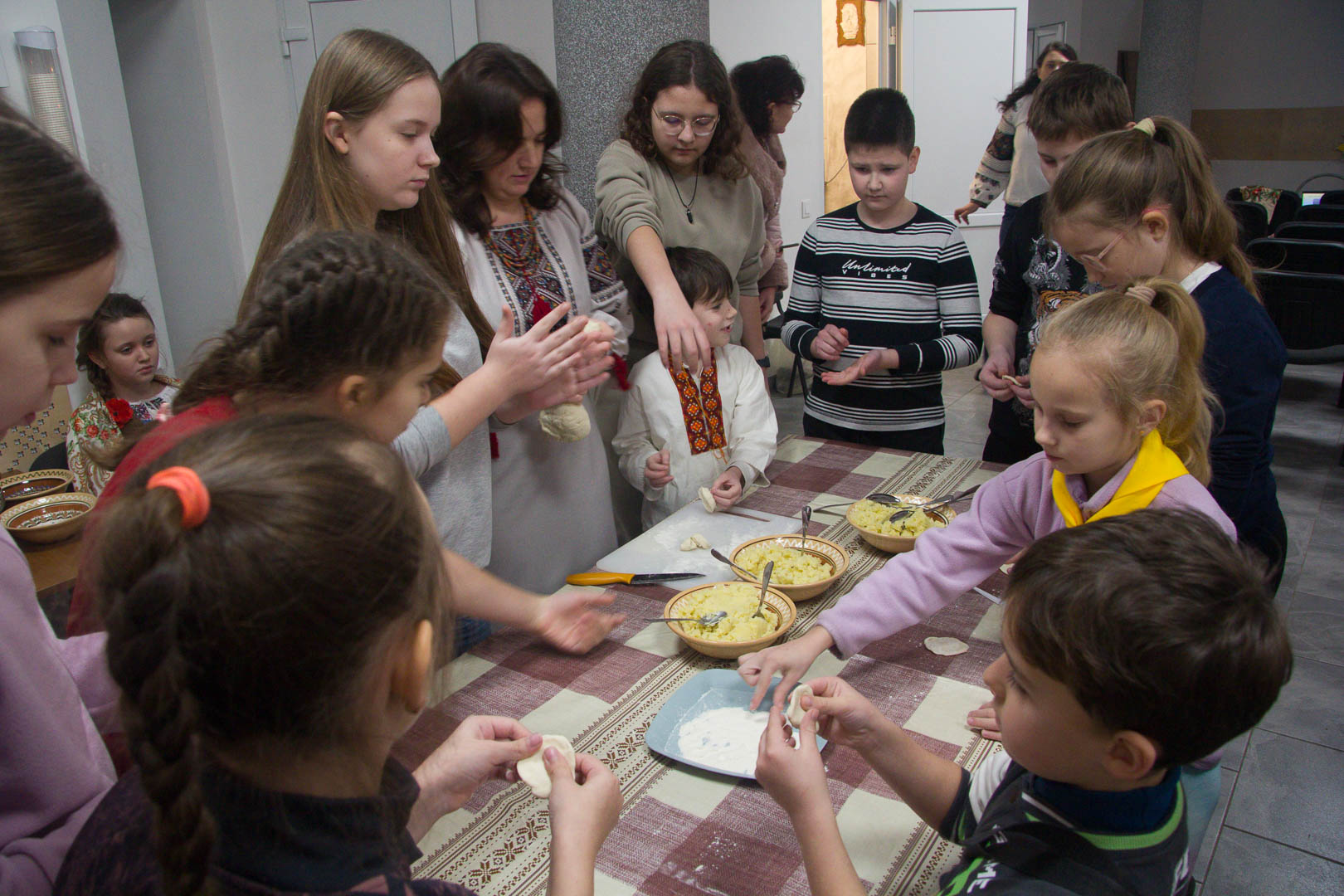 Особливо радісною частиною зустрічі стала практична частина, які провели пані Галина та добродійка Олена: діти мали можливість власноруч приготувати кутю та зліпити вареники, відкриваючи для себе живі різдвяні традиції.