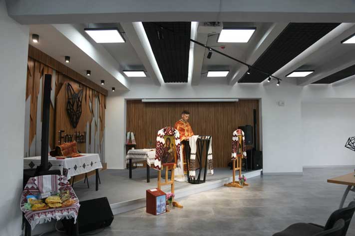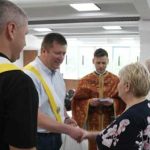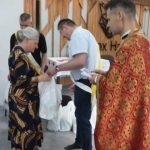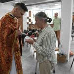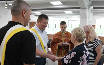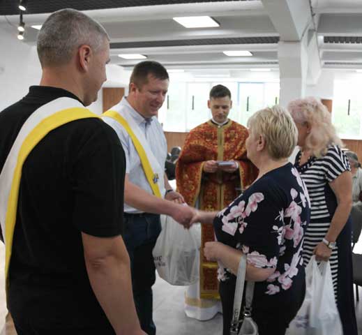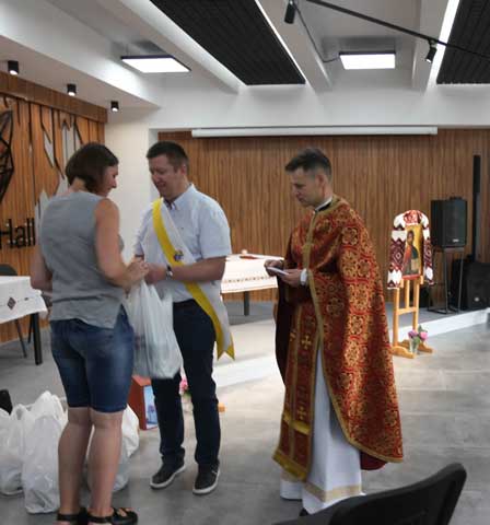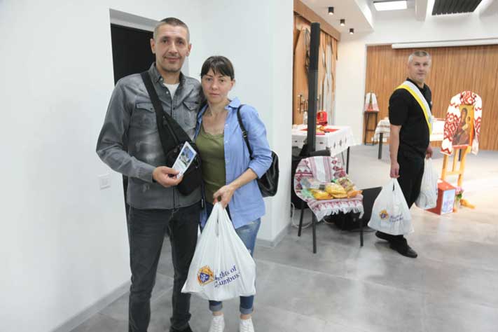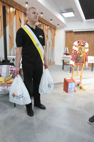 Розпочалась зустріч із Божественної Літургії. Після молитви Микола Мостов’як, національний радник спільноти «Лицарів Колумба в Україні» роздав продуктові набори. Продовжилась зустріч спілкуванням за кавою.